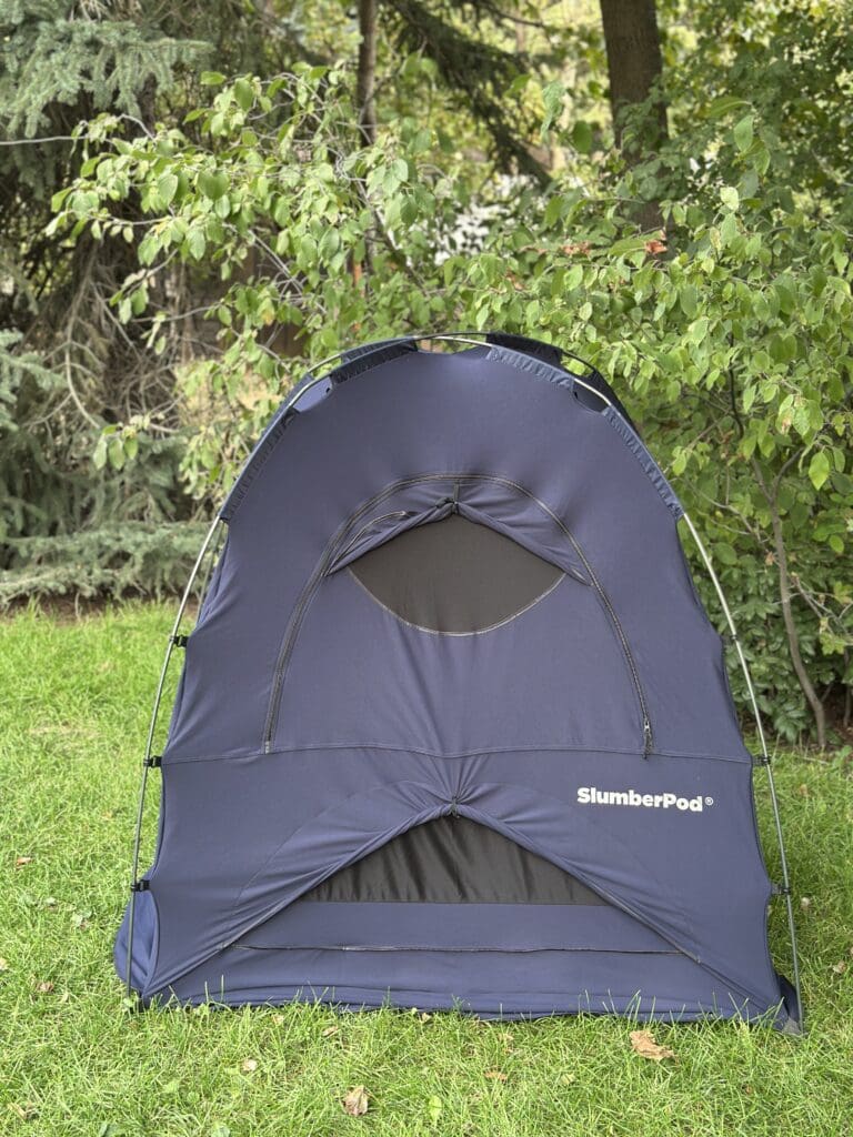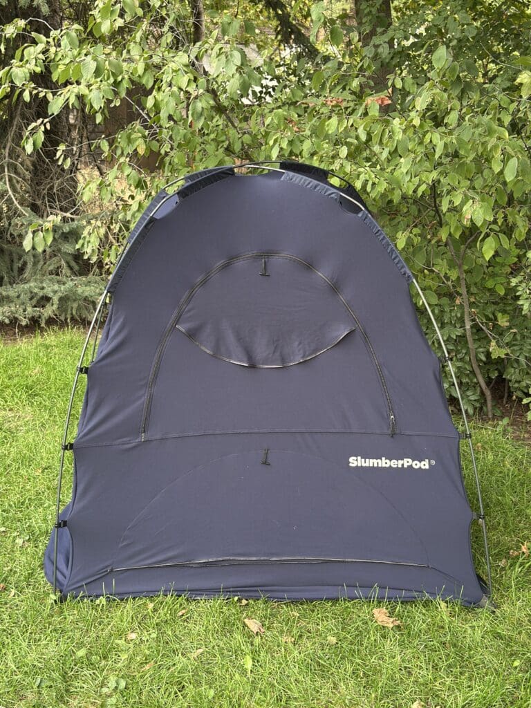 Amazon Basic Knock Off: This is about 1/2 the price of a SlumberPod with a tent dome as well, but it lets in quite a bit more light than the other two options, the material feels cheap and it has no information on if non-toxic materials are being used. (That’s an immediate no-go for me). The set up is quite easy and fast. This is a great budget option if you do want a tented version, but it is not has well built as the others.