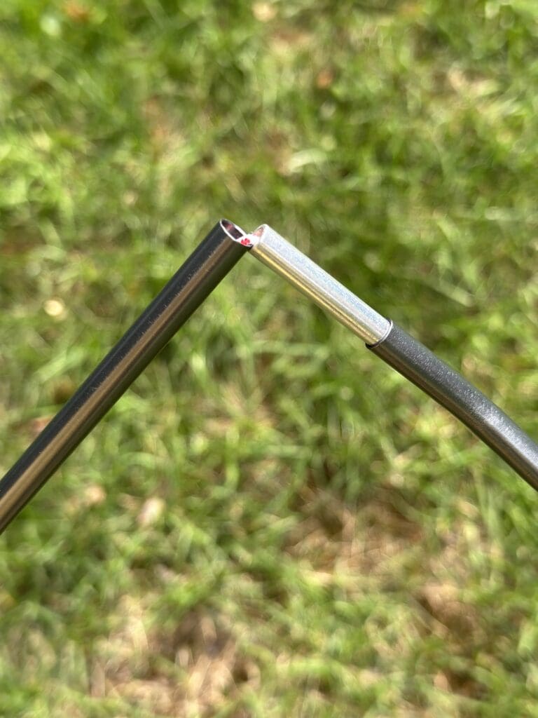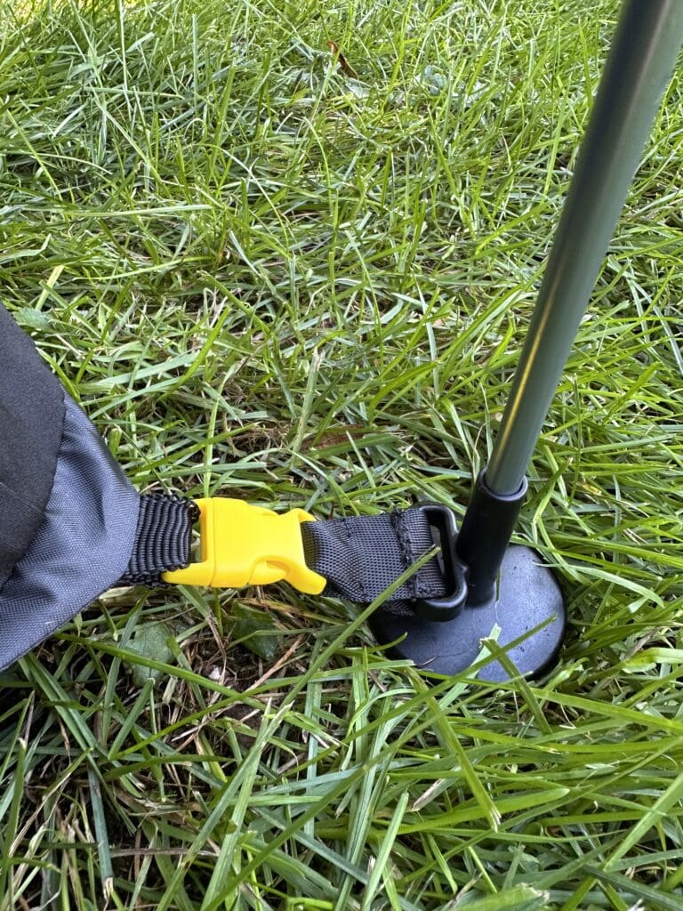 This is one of the biggest differences – the feet use plastic claw clips to connect the tent material with the poles vs the material pocket of the SlumberPod. It also has a plastic circular, flat base that logically would make the tent more stable, but I’m not sure it adds much.