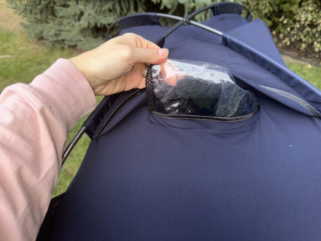 SlumberPod has two individual pockets on the top of the tent for the monitor and fan, which is different than Hiccapop’s one pocket. This feels quite a bit more secure to me, and unlike Hiccapop, there is no way that anything could fall onto your baby if the tent got bumped.