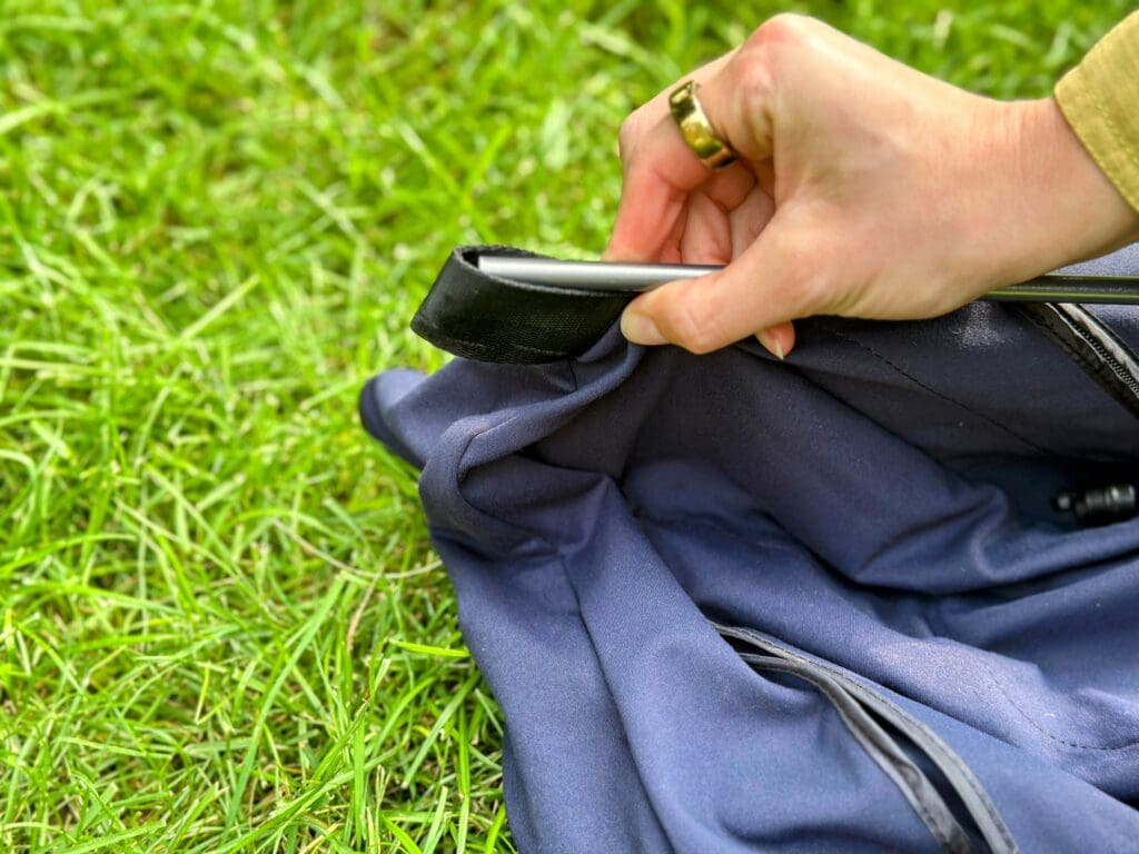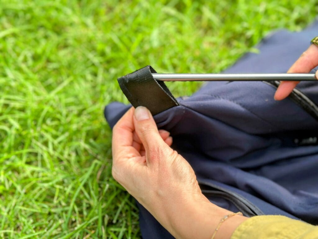 The ends of the poles slide into a pocket at the bottom of the SlumberPod. It’s quite a bit more secure and sturdy than it looks, and the poles have never once popped out. The tension that is created with the pressure on both sides holds the poles in securely. I personally like the SlumberPod’s “feet” more than Hiccapops.