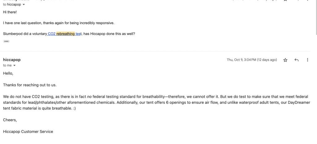SlumberPod: I emailed SlumberPod for confirmation about the non-toxic materials used, and they responded within 24-hours and were fairly responsive from that point. It wasn’t fast, but it didn’t feel like I waited forever.