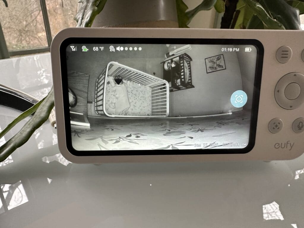 So, why does it matter? With the Eufy E21, when I zoom all the way in on E’s crib, I can see his chest rising and falling. I can count his breaths if I need to. I can see if his pacifier fell out or where Momo (his stuffy) is. The image on this camera remains crystal clear, even zooming in to 8x. This is the beauty of 4k, you can zoom in REALLY REALLY far and the quality is not impacted. This is not the case for all the other monitors I’ve tried.