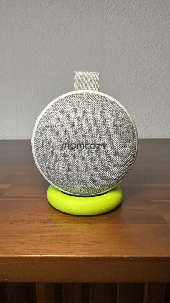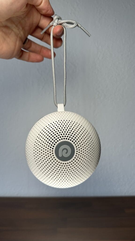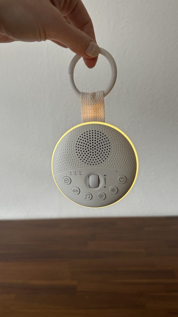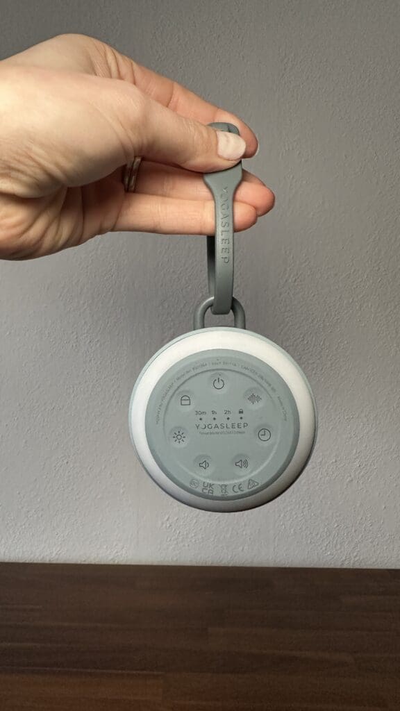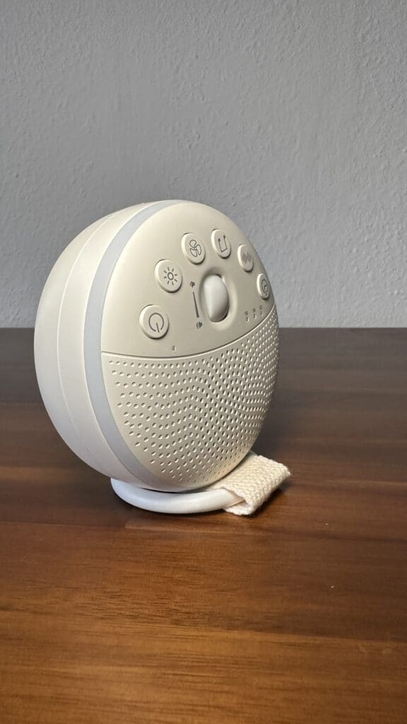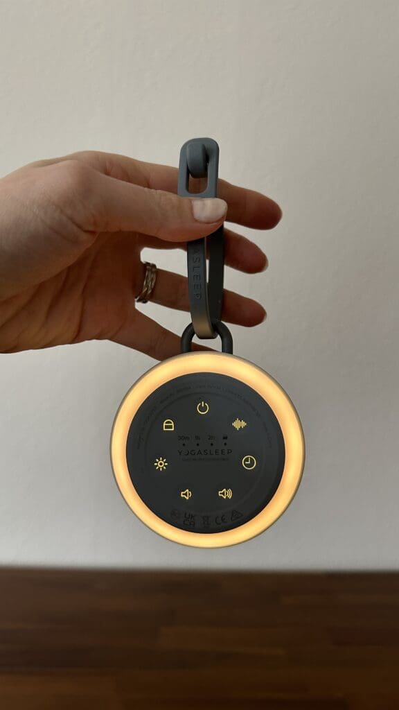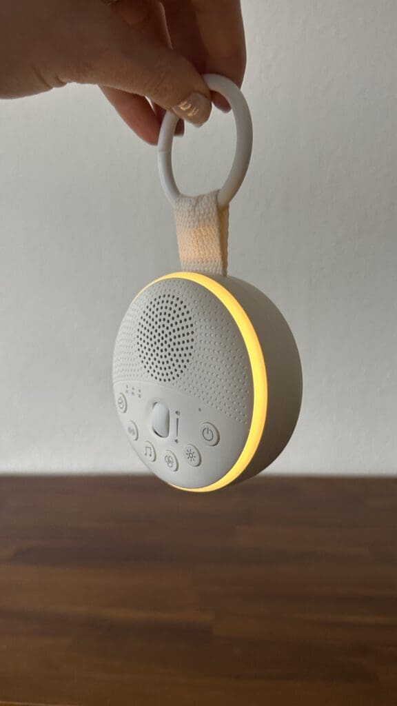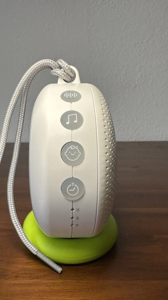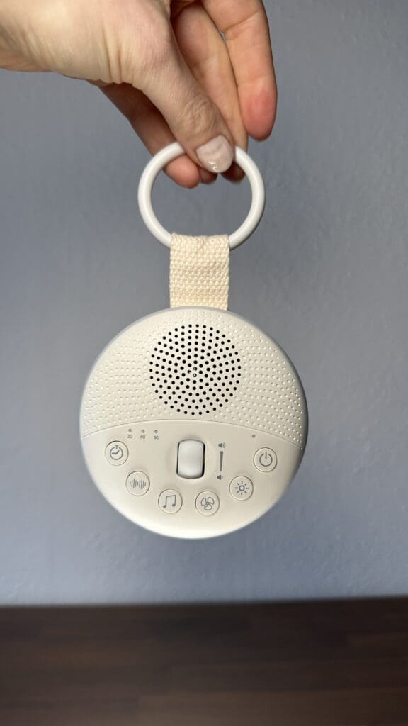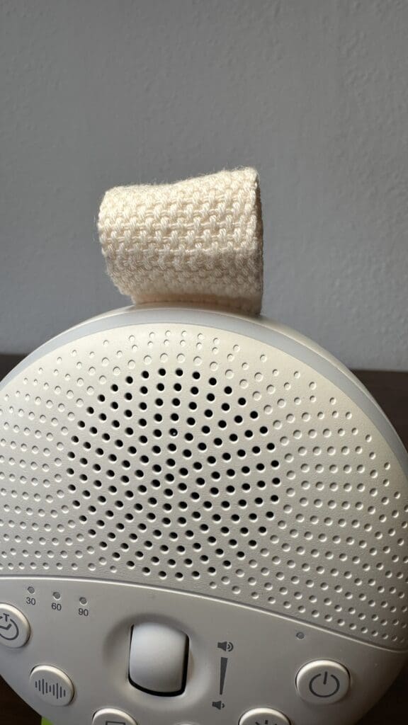 This sound machine does not include a nightlight, so if that is something you want, skip this one. It’s the only sound machine that uses strings to tie vs clip, which I personally don’t like as that feels like an extra step when trying to attach it to something.